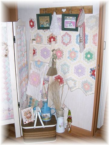 以前買った小さめのアンティークキルトを壁に貼りました。