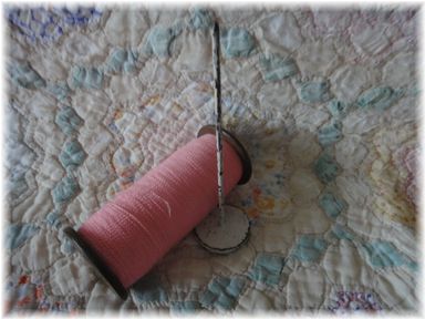左のアンティークのピンクの糸が巻いてある糸巻きと、
