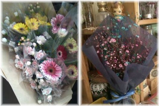 右のピンクとブルーのかすみ草の花束は、